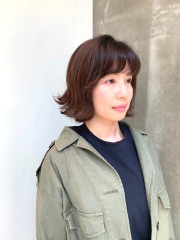 トップはフワリと大きめカール、全体に外ハネのワンカールでパーマをONです。