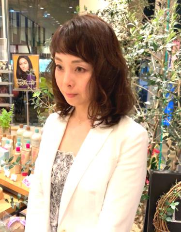 ナチュラルくせ髪をいかしてカット。バランス重視のスタイルつくり。前髪カットで華やかに!