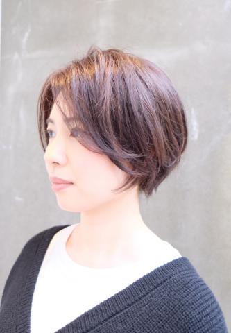 伸びた前髪をポイントに。中間〜毛先を大きくワンカール、全体にほんのりとパーマをのせました。