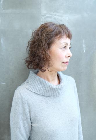 大人世代のオシャレスタイル。思い切って眉上でカットした前髪がデザインポイント!