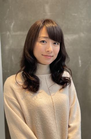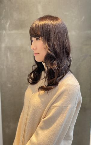 ホットパーマで、大きめのカールをプラス。カラーリングは優しい印象のアッシュブラウンを選択。