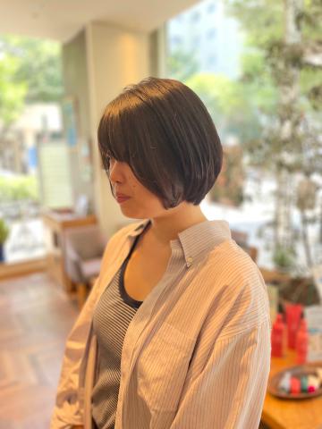 鎖骨レングスのミディアムスタイルから、顎レングスのスッキリボブスタイルにCUT。