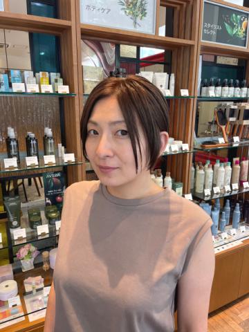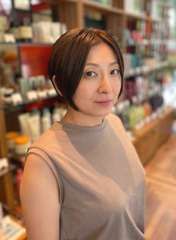 シンプル イズ ベスト!前下がりのショートボブスタイルを、大人の魅力で着こなします。