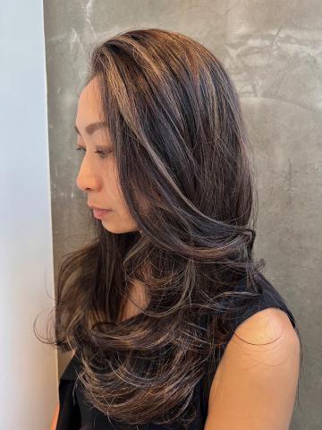 ベースのカラーは深みあるアッシュブラウン。ハイライトのオンカラーにはゴールドベージュを。