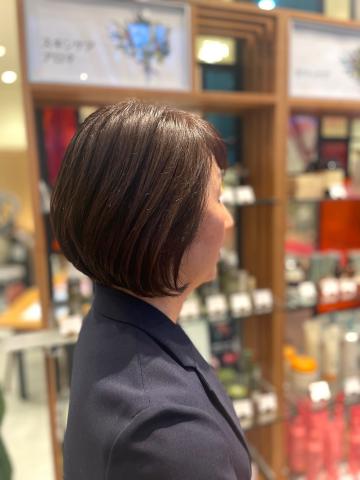 ヘアカラーには深みあるブラウンカラーを選択。ダメージなく、美しい髪色へ!艶々仕上げで完成!