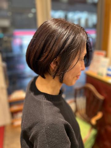 前髪長めのシンプルボブに、ゴールデンポイントから前下がりにローレイヤーをプラスしました。