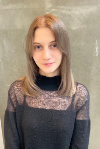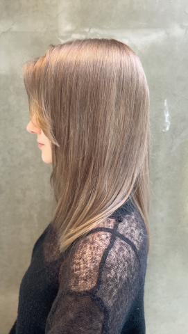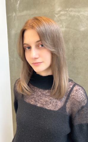 カラーリングには透明感あふれるブロンドベージュをのせて、ヌーディーに。
