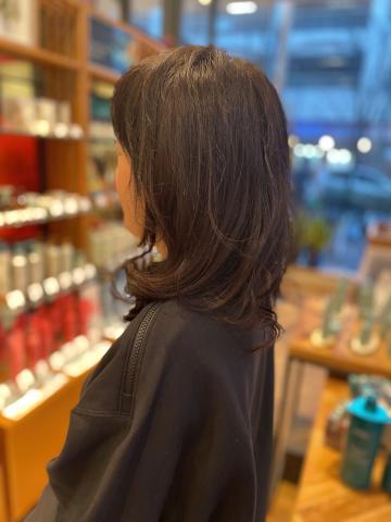 鎖骨レングスのミディアムスタイル。女性らしさと、優しい印象が素敵です。