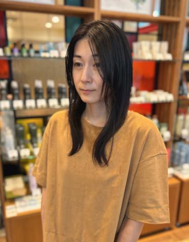 長めの前髪から低い位置でレイヤーをプラスして、自然な揺らぎを毛先にのせて、完成です!!