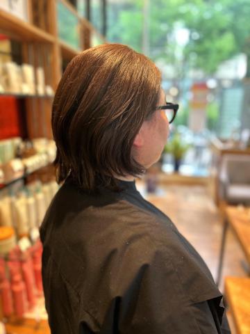 伸びていた髪を、肩上レングスにCUT!ヘアカラーには、優しい印象を纏うベージュカラーを選択!