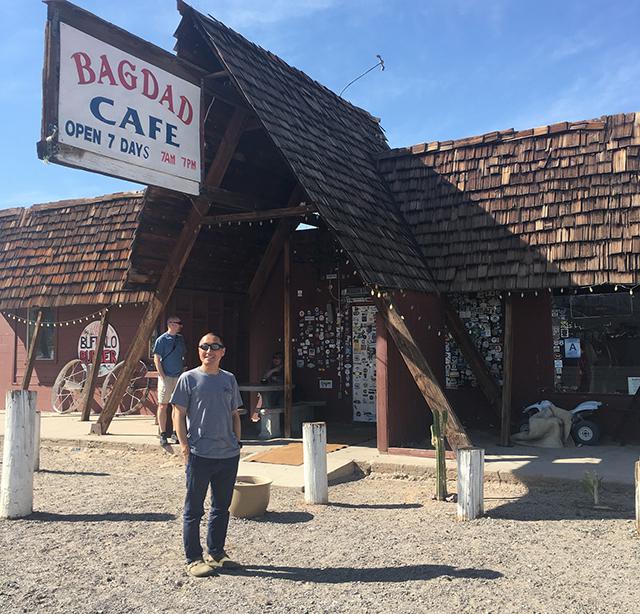 渋滞だらけの街中をなんとかくぐり抜け、砂漠を走破!途中給油も兼ねて立ち寄ろうと思っていたバグダッドカフェに到着