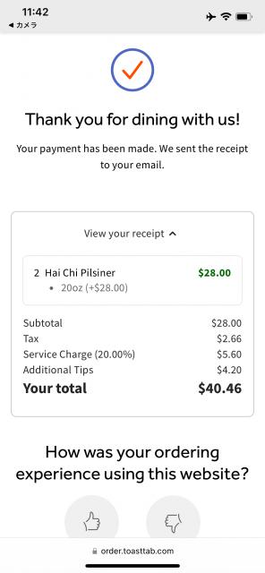 でもビール2杯で40ドル!なんなのー!しかもキャッシュの受け入れなし!